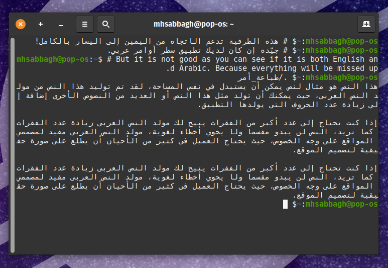 ميزة هذه الطريقة هي أنك لا تتدخل بإعدادات المستخدم؛ ستبقى طرفية المستخدم على إعداداتها الأساسية حسبما يحدد المستخدم في ملف .bashrc الخاص به (أو على الإعدادات الافتراضية التي هي LTR)، وفي نفس الوقت تضمن أن تطبيقك سيُعرض للمستخدم باتجاه RTL بالكامل، مما يوفر تجربة استخدام جميلة جدًا للغة العربية في الطرفية.
