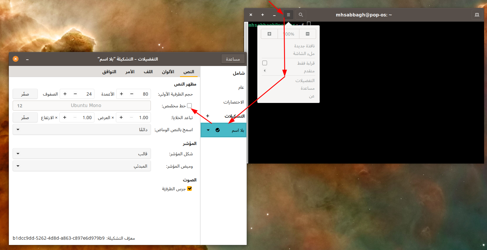 من إعدادات طرفية جنوم، اختر استعمال خط مُخصص من نافذة الإعدادات كما بالصورة (اضغط على المربع الفارغ لتظهر علامة صحّ):