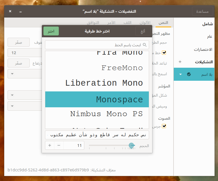 بعدها ابحث عن خط اسمه Monospace من القائمة، واختر الحجم 11 كما في الصورة واضغط “اختر”: