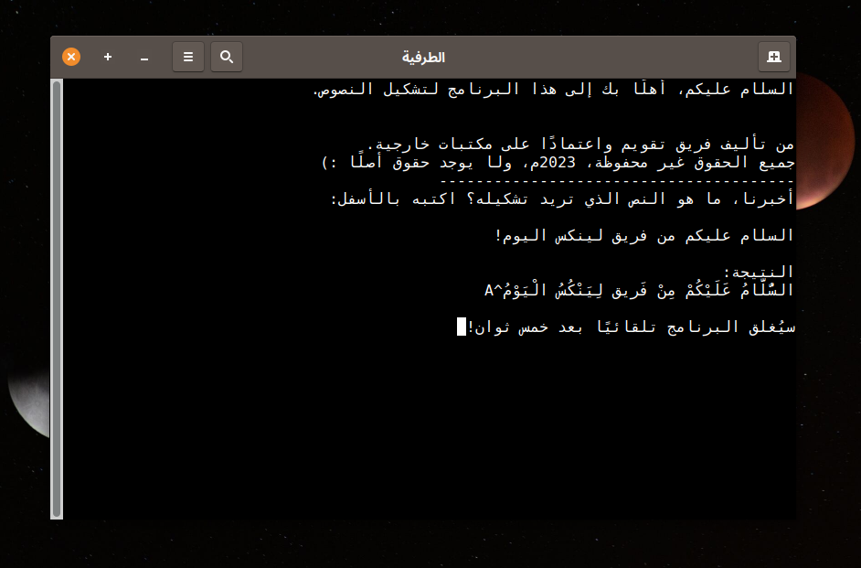 بالطبع يمكنك تغيير البرنامج وتخصيصه حسب حاجتك، ولكن هذا مجرّد مثال ليريك طريقة عمل البرامج العربية من سطر أوامر لينكس.