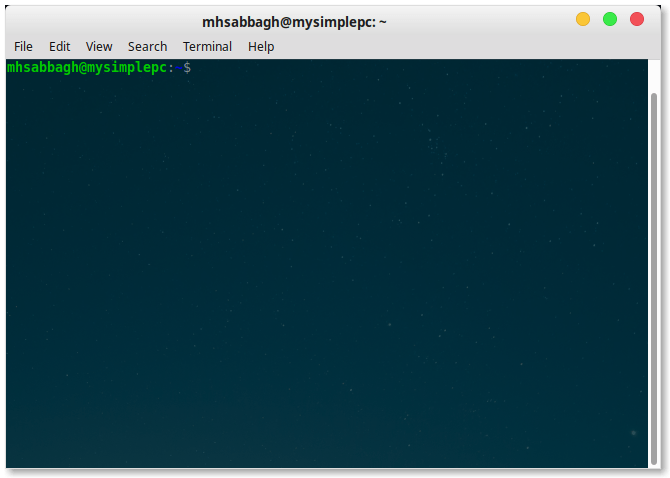 دعنا نبدأ بفتح تطبيق “محاكي الطرفية” أو “Terminal Emulator” ، والذي سيفتح لنا جلسة صدفة جديدة في نافذة منفصلة. ابحث عن “الطرفية” أو “Terminal” في قائمة التطبيقات على نظامك وشغّله لتجد نافذة تفتح لك كالتالي: