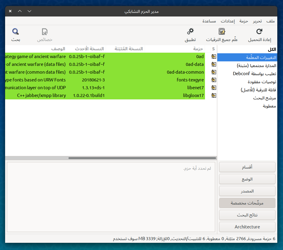 - هنا يمكنك رؤية عدد الحزم المتوفرة للتثبيت أو تلك المثبتة على جهازك بالإضافة لأنواعٍ أخرى من الحزم.